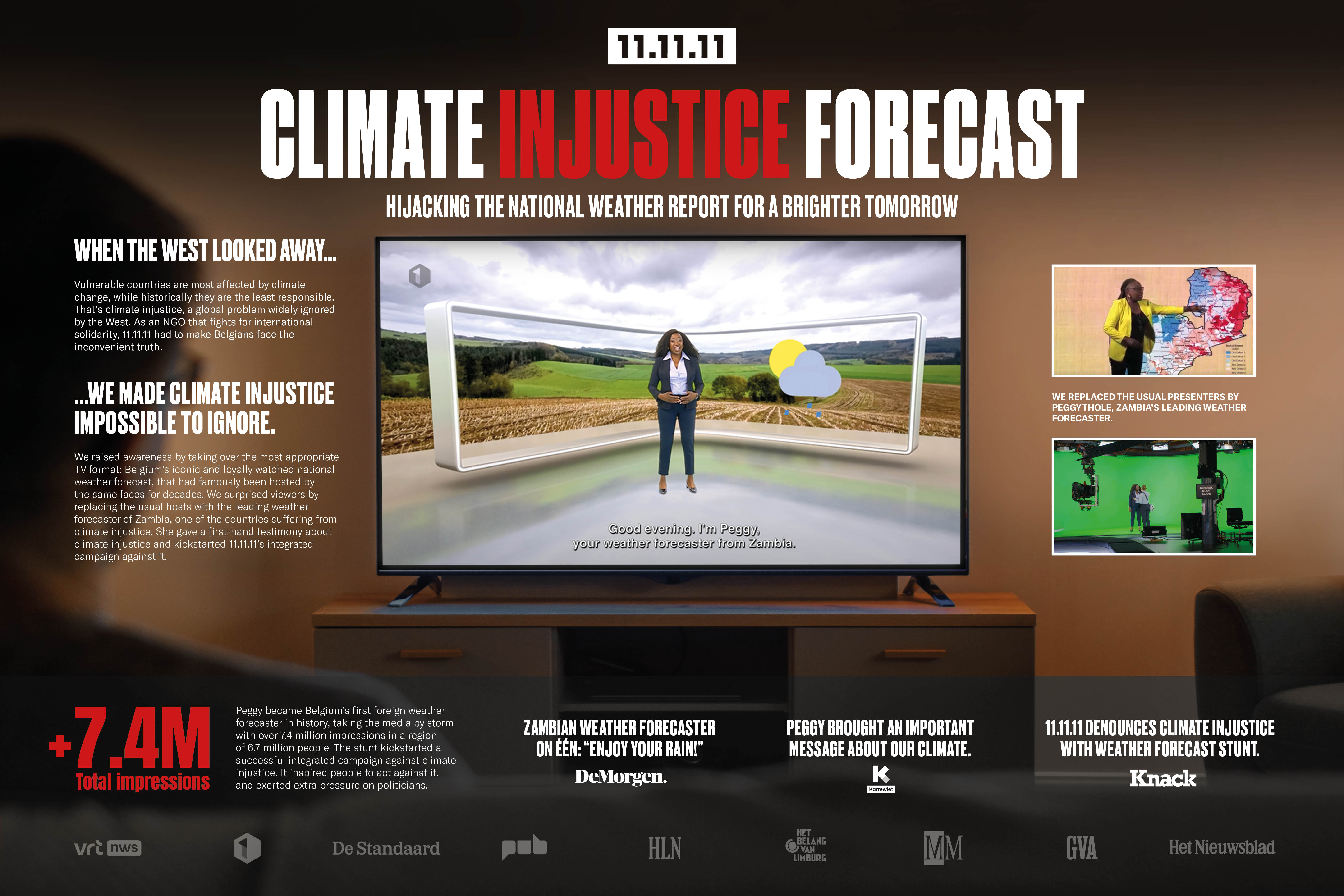 As an NGO that fights for international solidarity, 11.11.11 had to make Belgians face the inconvenient truth. So we hijacked the national weather forecast, an iconic and loyally watched TV format, and replaced the usual presenters by Zambia’s leading weather forecaster. Her first-hand testimony on climate injustice completely surprised viewers and took the media by storm. It kickstarted an integrated campaign that inspired millions of Belgians to take action.